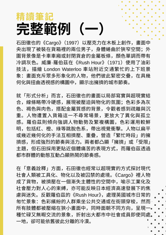 以下呢張係筆記提供的「完整範例」開頭頁。你最適合用佢做文章中段的「逐段拆解」:一邊展示例子,一邊逐句指出佢屬於描述/分析/詮釋/評價邊一部份。